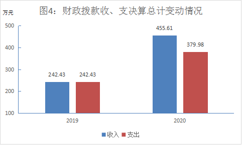 2020年财政拨款收入总计455.61万元,支出总计379.98万元。与2019年相比,财政拨款收入增加213.18万元,增长88%,支出总计增加137.55万元,增长56.7%。主要变动原因是2020年开展了第七次全国人口普查和脱贫攻坚普查,一般公共预算财政拨款收入增加。