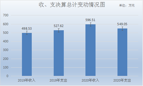 2020年度收、支总计596.51万元、549.05万元。与2019年相比,收、支总计各增加97.98万元、21.43万元,增长19.65%、4.06%。主要变动原因是行政区划调整后,我乡编制内实有人数增加,基本支出及日常事务公用支出收支增加。