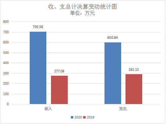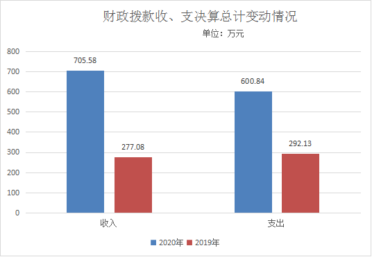 2020年度收入总计705.58万元,支出总计600.84万元,结余117.09万元。与2019年相比,收入总计增加428.5万元,增长154%;支出总计增加308.71,增长105%。主要变动原因是机构改革后,县精神文明建设委员会办公室合并至县委宣传部,县文明办用于乡村学校少年宫的中央、省级补助资金、运行维护费、社会主义核心价值观建设等费用较多;公益电影放映补助资金48.36万元;用于新中国成立70周年氛围营造5万元;70周年经济社会发展成就宣传经费16.72万元;70周年栖凤廊桥摄影展费15万元。