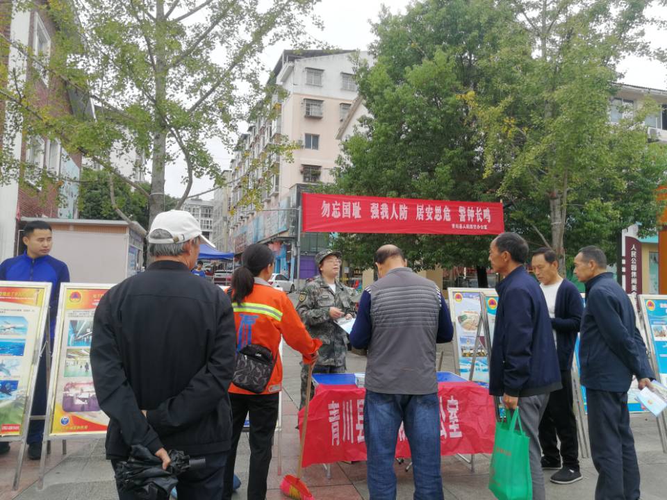 “勿忘国耻、强我人防,居安思危,警钟长鸣”“战时防空、平时服务、应急支援”的横幅在青川县人民广场上空迎风招展,广场的空地上整齐的摆放着20多张人民防空展板和各种应急救援装备,青川县人防办和消防大队共同开展纪念九一八事变91周年宣传活动正在进行。