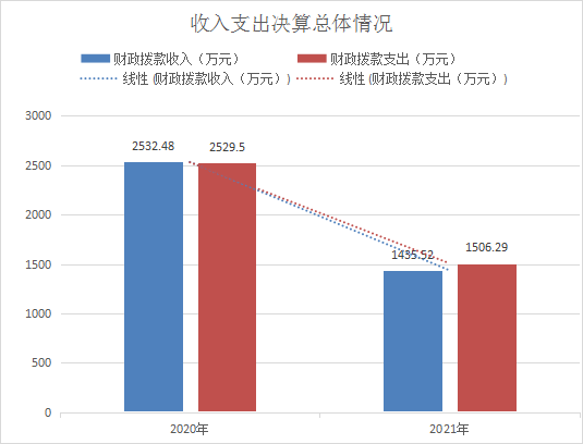 2021年度收入总计1435.52万元、支出总计1506.29万元。与2020年相比,收入总计减少1096.96万元,下降43.32%、支出总计减少1023.21万元,下降40.45%。主要变动原因是2020年农民工应急周转金1120万元纳入当年收入及支出,2021年无农民工应急周转金。