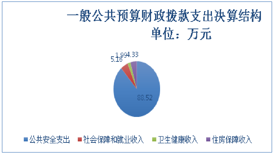 2021年一般公共预算财政拨款支出1089.13万元,主要用于以下方面:公共安全(类)支出964.10万元,占88.52%;社会保障和就业(类)支出56.18万元,占5.16%;卫生健康支出21.69万元,占1.99%;住房保障(类)支出47.16万元,占4.33%。