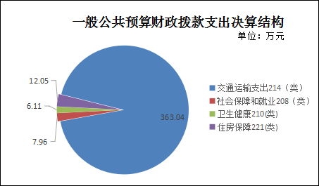 2021年一般公共预算财政拨款支出389.16.00万元,主要用于以下方面:交通运输支出214(类)支出363.04万元,占93.28%;社会保障和就业208(类)支出7.96万元,占2.04%;卫生健康210(类)支出6.11万元,占1.57%;住房保障221(类)支出12.05万元,占3.09%。