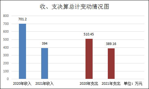 2021年度收、支总计394.00万元。与2020年相比,收入总计减少307.20万,下降43%,支出总计减少121.29万元,下降23.76%。主要变动原因是项目个数减少,项目资金相应减少。