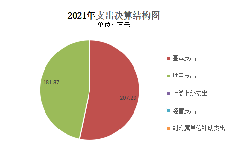 2021年本年支出合计389.16万元,其中:基本支出207.29万元,占53.27%;项目支出181.87万元,占46.73%;上缴上级支出0万元;经营支出0万元;对附属单位补助支出0万元。