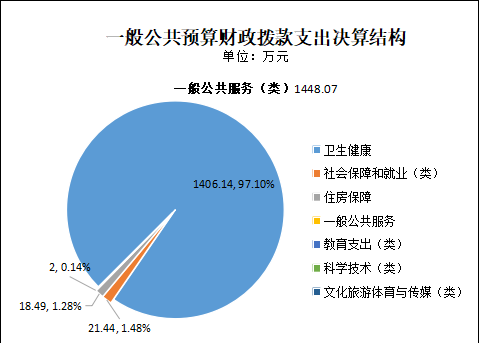 2021年一般公共预算财政拨款支出1448.07万元,主要用于以下方面:一般公共服务201(类)支出2万元;社会保障和就业208(类)支出21.44万元,占2%;卫生健康支出210(类))1406.14万元,占97%;住房保障支出221(类)18.49万元,占1%。