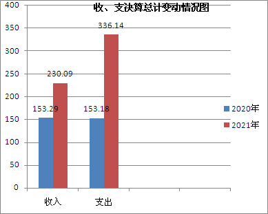 2021年度收入合计230.09万元,支出合计336.14万元,与2020收入153.29万元、支出153.18万元相比,收入总计增加76.80万元,支出总计增加182.96万元,收入总计增加了50.10%,支出总计增加了119.44%。收入增加的主要原因是年中追加了退休人员医疗保险,退休人员独生子女一次性补贴,2020年在职人员目标奖、退休人员慰问金、在职人员调资等。支出增加主要是增加了年初结转资金支出。