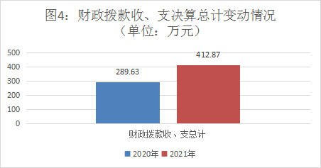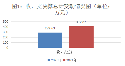 2021年度收、支总计412.87万元。与2020年相比,收、支总计各增加123.24万元,增长42.55%。主要变动原因是项目增加。 |