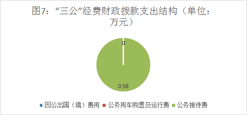2021年“三公”经费财政拨款支出决算中,因公出国(境)费支出决算0万元,占0%;公务用车购置及运行维护费支出决算0万元,占0%;公务接待费支出决算0.58万元,占100%。具体情况如下: