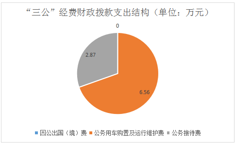 2021年“三公”经费财政拨款支出决算中,因公出国(境)费支出决算0万元;公务用车购置及运行维护费支出决算6.56万元,占69.6%;公务接待费支出决算2.87万元,占30.4%。具体情况如下: