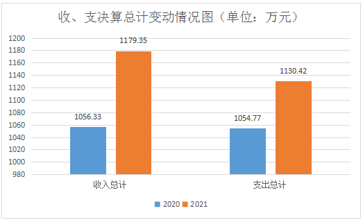 2021年度收入总计1179.35万元,支出总计1130.42万元。与2020年相比,收入增加123.02万元,增长11.6%;支出增加75.65万元,增长7.2%。主要变动原因是:人员经费、公用经费增加,基本支出增加。