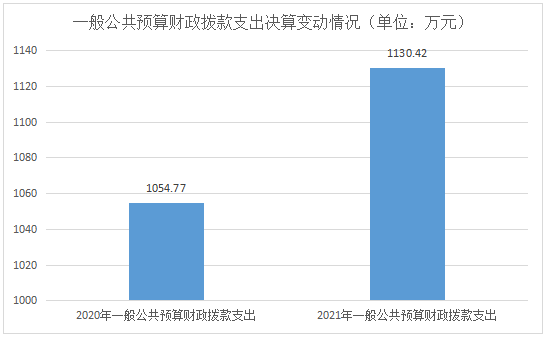 2021年一般公共预算财政拨款支出1130.42万元,占本年支出合计的100%。与2020年相比,一般公共预算财政拨款支出增加75.65万元,增长7.2%。主要变动原因是人员经费、公用经费增加,基本支出增加。