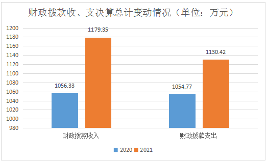 2021年度财政拨款收入总计1179.35万元,支出总计1130.42万元。与2020年相比,收入增加123.02万元,增长11.6%;支出增加75.65万元,增长7.2%。主要变动原因是人员经费、公用经费增加,基本支出增加。