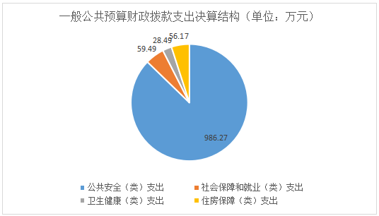 2021年一般公共预算财政拨款支出1130.42万元,主要用于以下方面:公共安全(类)支出986.27万元,占87.2%;社会保障和就业(类)支出59.49万元,占5.3%;卫生健康(类)支出28.49万元,占2.5%;住房保障(类)支出56.17万元,占5%。