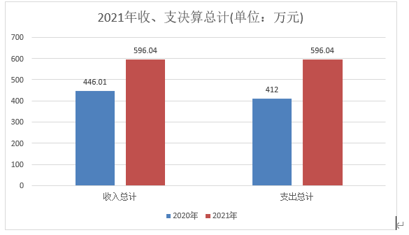 2021年度收入总计596.04万元、支出总计596.04万元。与2020年相比,收入总计增加150.03万元,增长33.63%; 支出总计增加184.04万元,增长44.67%。主要变动原因是存量资金安排指标。