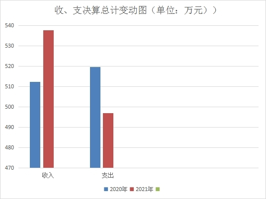 2021年度收入总计537.70万元、支出总计496.86万元。与2020年相比,收入增加25.34万元、增加5.1%。主要原因为本年度规培人员返回医院开展业务,收入增加。支出减少22.94万元,下降4.41%,主要原因为本年度努力增收节支。