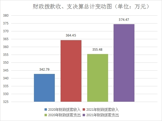 2021年财政拨款收入总计364.45万元、支出总计374.47万元。与2020年相比,财政拨款收入增加21.66万元、支出增加18.99万元,各增长6.3%、5.3%。主要变动原因是项目支出增加。