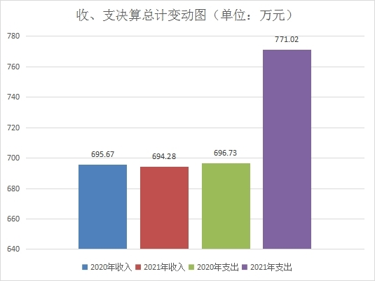 2021年度收入总计694.28万元、支出总计696.73万元。与2020年相比,收入减少1.39万元、支出减少74.29万元,分别下降0.2%、9.6%。主要变动原因是本年收入较上年下降,故本年节省开支。