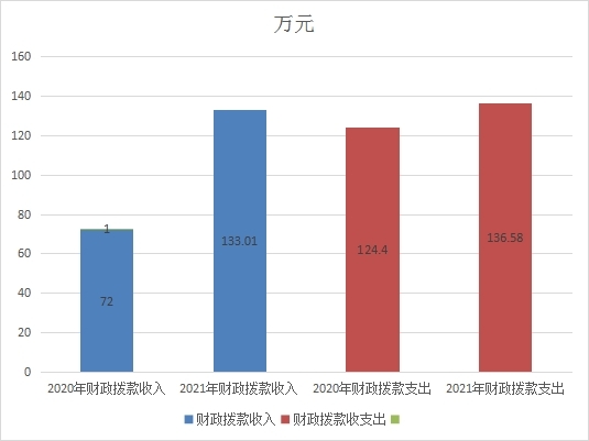 2021年财政拨款收入总计133.01万元。与2020年相比,财政拨款收入上升9.00万元,上升7.26%。财政拨款支出总计136.58万元。与2020年相比,财政拨款支出上升12.15万元,上升9.76%。主要变动收入上升是财政拨款正常调资增加疫情防控财政补助增加,财政拨款支出上升主要是预算收入增加、支出同时增加。
