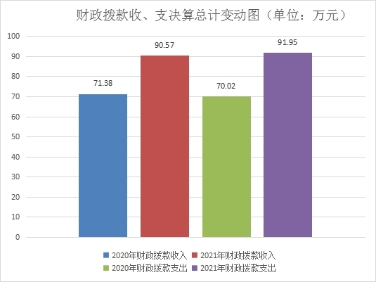 2021年财政拨款收入总计90.57万元、支出总计91.95万元。与2020年相比,财政拨款收入增加19.19万元、支出增加21.93万元,各增长26.88%、31.32%。主要变动原因是人员工资调整及上年项目结转资金在本年列支,故收支均增加。