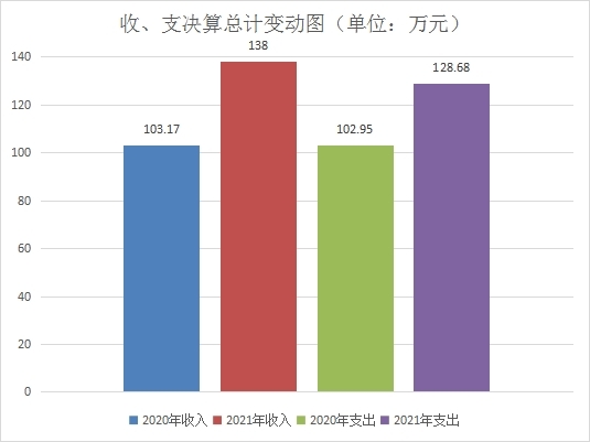 2021年度收入总计138万元、支出总计128.68万元。与2020年相比,收入增加34.83万元、支出增加25.73万元,收入增长33.76%,支出增长24.99%。主要变动原因是人员支出增加及上年项目结转资金在本年列支,故支出增加。