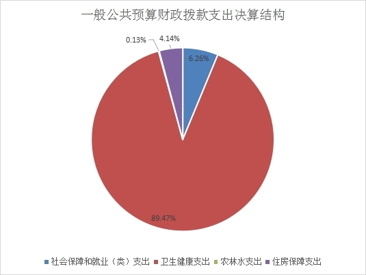 2021年一般公共预算财政拨款支出91.95万元,主要用于以下方面:社会保障和就业(类)支出5.76万元,占6.26%;卫生健康支出82.27万元,占89.47%;农林水支出0.12万元,占0.13%;住房保障支出3.8万元,占4.14%。