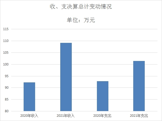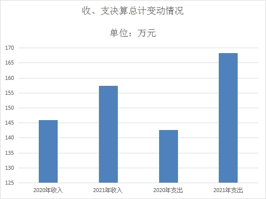 2021年度收入、支总计157.34万元、168.32万元。与2020年相比,收、支总计各增加11.33万元、增加25.62万元,增长7.76%,增长17.95%。主要变动原因:收入增加主要原因是疫情防控资金收入增加,支出增加主要原因是疫情防控支出增加。