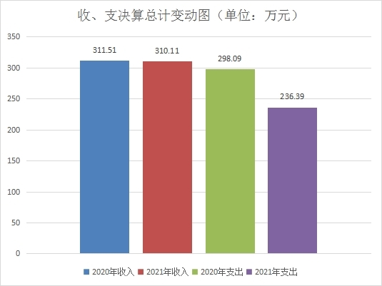 2021年度收入总计310.11万元、支出总计236.39万元。与2020年相比,收入比上年减少1.39万元、减少0.45%,支出总计减少61.69万元,下降20.7%。主要变动原因是本年度事业收入减少、应付药款部分未付。