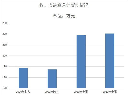 2021年财政拨款收入219.21万元、支出总计220.52万元。与2020年相比,财政拨款收入总计减少1.29万元、支出总计增加1.31万元,收入下降0.68%、支出增长0.59%。主要变动原因:人员增加、疫情防控资金增加。