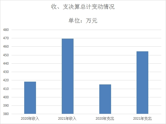 2021年度收入、支总计469.62万元、454.35万元。与2020年相比,收、支总计各增加51.12万元、增加39.14万元,增长12.21%,增长9.43%。主要变动原因:收入增加主要原因是疫情防控资金收入增加和业务收入增加,支出增加主要原因是疫情防控支出增加。
