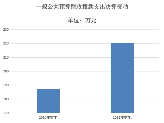2021年一般公共预算财政拨款支出220.52万元,占本年支出合计的48.53%。与2020年相比,一般公共预算财政拨款支出增加33.07万元,增长17.64%。主要变动原因是人员增加,疫情防控工作资金投入大。