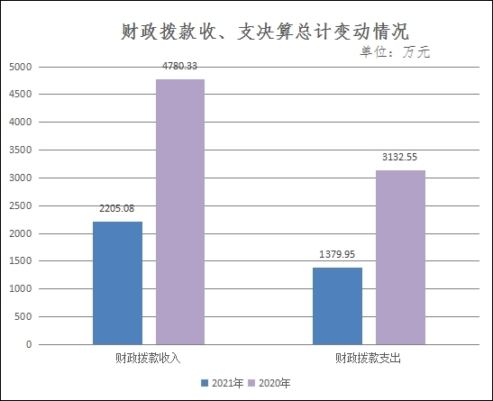 2021年度财政拨款年初结转和结余1,647.78万元,本年收入557.3万元,本年支出1,379.95万元,年末结转和结余825.12万元。2021年财政拨款总收入2,205.08万元(含年初结转和结余),与2020年财政拨款总收入4,780.33万元相比减少2,575.25万元,下降54%,主要原因是2021年年初财政拨款资金结转和结余与2020年年初结转和结余相比减少1,658.23万元,2021年本年财政拨款收入与2020年相比减少了抗疫特别国债设施设备采购资金1,000万元。2021年财政资金支付为1,379.95万元,与2020年支出3,132.55万元相比减少1,752.6万元,下降56%,主要原因是:基本人员经费减少106.79万元,主要是2020年增加了以前年度政府目标考核绩效工资;基本公用经费增加12.74万元;项目支出减少1,658.54元,主要是减少抗疫特别国债设施设备采购支出1,000万元、住院综合楼建设项目减少592万元。