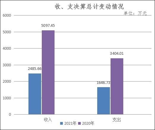 2021年年初结转和结余1,647.78万元,本年收入837.87万元,本年支出1,646.73万元,结余分配13.81万元,年末结转和结余825.12万元。2021年度总收入2,485.66万元(含年初结转和结余),与2020年度总收入5,097.45万元相比减少2,611.79万元,下降51%,主要原因是2021年年初结转和结余与2020年年初结转和结余相比减少1,658.23万元,2021年本年收入与2020年相比减少了抗疫特别国债设施设备采购资金1,000万元。2021年支出1,646.73万元,与2020年支出3,404.01万元相比减少1,757.28万元,下降52%,其中:人员经费减少82.68万元元,下降12.88%,主要原因是2020年增加了以前年度政府目标考核绩效工资;公用经费减少16.06万元,下降8.93%;项目支出减少1,658.54元,下降64.24%,主要原因是减少抗疫特别国债设施设备采购支出1,000万元、住院综合楼建设项目减少592万元。