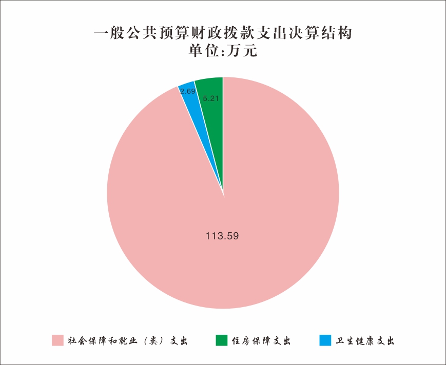 2020年一般公共预算财政拨款支出121.49万元,主要用于以下方面:社会保障和就业(类)支出113.6万元,占93%;卫生健康支出2.69万元,占2.5%;住房保障支出5.21万元,占4.5%。