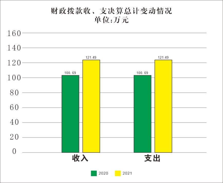 2021年财政拨款收入总计121.49万元,其中上年结转和结余13万元;总支出总计121.49万元。与2020年相比,财政拨款收入总计增加7.8万元,增加8%;支出总计增加20.8万元,增加20%。主要变动原因:2021年本年度财政预算增加去世职工抚恤金29.89万元。