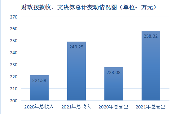 青川县凉水镇茅坝小学2021年财政拨款收入总计249.25万元、支出总计258.32万元。与2020年相比,财政拨款收入增加27.87万元,增长12.59%;财政拨款支出增加30.24万元,增长13.26%,以上主要变动原因:补发以前年度年度奖金、退休人员一次性补助、职工晋级工资调整。
