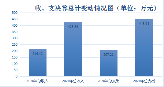 2021年竹园镇幼儿园收入总计425.84万元,支出总计448.91万元。与2020年相比,收入总计增加211.42万元、支出增加241.7万元。总收入变动的主要原因为:一是一般公共预算财政拨款收入增加了132.37万元,主要原因为项目拨款;二是事业收入增加79.03万元,主要为2020年秋保缴费收入;三是其他收入增加了0.02万元,主要为利息收入。总支出变动的主要原因为:一是教育支出增加240.89万元,主要支出为补发以前年度年度奖金、退休人员一次性补助、职工晋级工资调整以及项目资金等;二是社会保障和就业支出减少3.9万元,主要为退休1人;三是卫生健康支出增加0.62万元,主要为职工缴费基数增加;四是住房保障支出增加4.09万元,主要为将发放的人员奖金纳入住房公积金缴存基数。