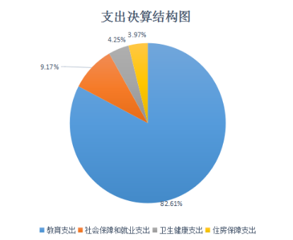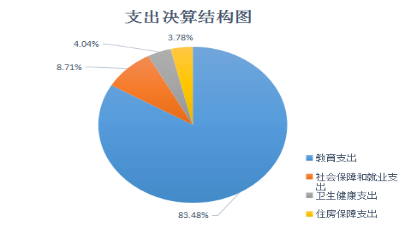 四川省青川中学校2021年一般公共预算财政支出合计2556.08万元。其中基本支出2493.21万元,包括普通教育支出2048.61万元,占82.17 %;社会保障和就业支出234.35万元,占9.40 %;卫生健康支出108.64万元,占 4.36%;住房保障支出101.60万元,占4.08 %。