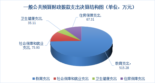 2021年一般公共预算财政拨款支出693.63万元,主要用于以下方面:教育支出515.28万元,占74.28%;社会保障和就业支出75.93万元,占10.94%;卫生健康支出35.11万元,占5.06%;住房保障支出67.31万元,占9.72%。