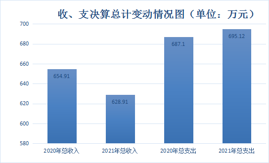 2021年度收入总计628.91万元,支出总计695.12万元。与2020年相比,收入总计减少26万元,下降3.97%;支出总计增加8.02,增长1.17%。总收入主要变动原因是一般公共预算财政拨款收入减少了20.64万元,主要原因为教职工较2020年相比减少了2人,退休1人,调出1人;二是其他收入减少5.36万元,主要为2021年无政府拨款和生育津贴调账,2021年只有师培经费。总支出变动的主要原因为:一是教育支出减少20.74万元,主要为人员减少2人,商品服务支出减少;二是社会保障和就业支出增加6.61万元,主要为保险基数调整以及补缴12年特岗保险;三是卫生健康支出增加4.71万元,主要为医疗保险缴存基数增加;四是住房保障支出增加17.44万元,主要为将发放的人员奖金纳入住房公积金缴存基数。