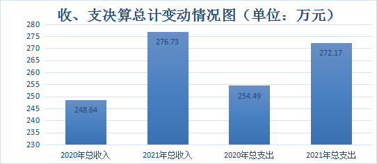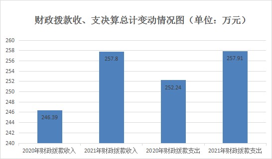 2021年财政拨款收入总计257.8万元,支出总计257.91万元。与2020年相比,财政拨款收入增加11.41万元,增长4.63%,支出总计增加5.67万元,增长2.25%。主要变动原因是补发以前年度奖金、退休人员一次性补助、职工正常晋升、岗位变动等工资调整。