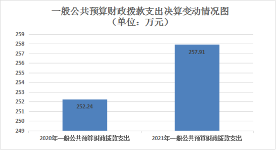 2021年一般公共预算财政拨款支出257.91万元,占本年支出合计的100%。与2020年相比,一般公共预算财政拨款支出增加5.67万元,增长2.25%。主要变动原因是补发以前年度奖金、退休人员一次性补助、职工正常晋升、岗位变动等工资调整。