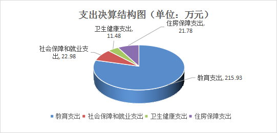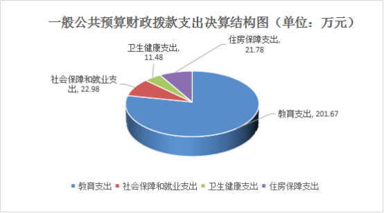 2021年一般公共预算财政拨款支出257.91万元,主要用于以下方面:教育支出(类)201.67万元,占78.19%;社会保障和就业(类)支出22.98万元,占8.92%;卫生健康支出11.48万元,占4.45%;住房保障支出21.78万元,占8.44%。