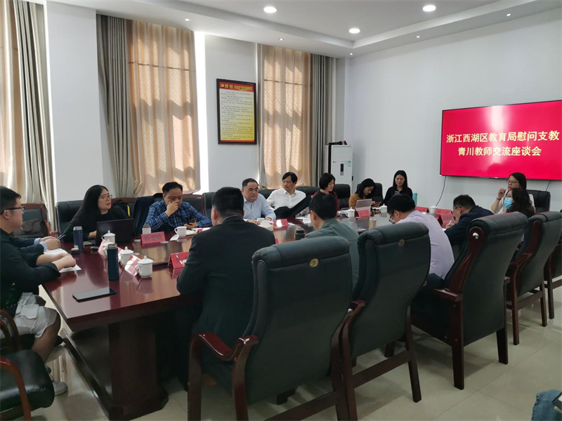 座谈会上,县教育局局长吴应华、西湖区教育局副局长黄志元分别就青川、西湖教育情况做了交流介绍,支教青川教师代表姚威做了支教汇报,两地教育局班子成员、中层干部分别就两地教育合作进行深入讨论,并达成共识。吴应华代表青川教育人感谢东西部协作项目,感谢西湖区教育局的鼎力支持,感谢支教教师的爱心奉献,并表示希望未来加强互动交流,借力东西部协作东风,促进乡村教师成长和乡村学校教育质量提升。黄志元代表西湖区教育局介绍了该区先进教育经验,讲解了教育改革示范案例,就深化两地教育合作提出了完善结对机制、做实帮扶项目、拓展交流协作、增加结对帮扶学校等意见,并表示只要青川教育需要,西湖教育定倾囊相授,全力助推青川教育高质量发展。