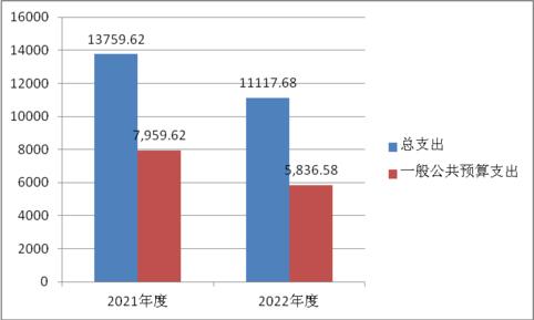 2022年一般公共预算财政拨款支出5,836.58万元,占本年支出合计的52.5%。与2021年相比,一般公共预算财政拨款支出减少2,123.04万元,下降26.7%。主要变动原因是部分水利工程完工,本年新增项目投资减少。