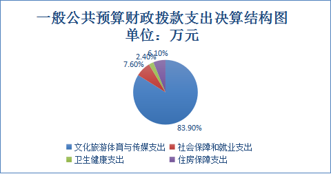 2022年一般公共预算财政拨款支出 138.37 万元,主要用于以下方面:文化旅游体育与传媒支出116.13万元,占 83.90 %;社会保障和就业支出 10.50 万元,占7.60 %;卫生健康支出 3.25万元,占2.40%;住房保障支出 8.50万元,占6.10 %。