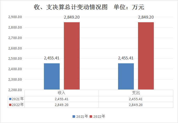 2022年度收、支总计2,849.2万元。与2021年相比,收、支各总计增加393.79万元,增长16.03%。主要变动原因是人员增加,项目经费增加。