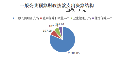 2022年一般公共预算财政拨款支出2,829.20万元,主要用于以下方面:一般公共服务支出2,301.05万元,占81.33%;社会保障和就业支出197.95万元,占7%;卫生健康支出187.59万元,占6.63%;住房保障支出142.61万元,占5.04%。