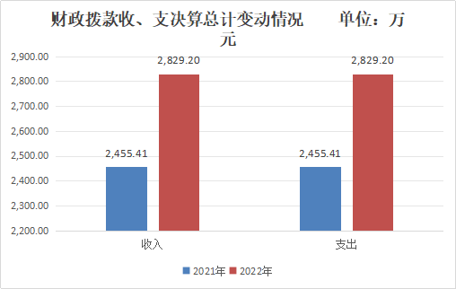 2022年财政拨款收、支总计2829.2万元。与2021年相比,财政拨款收、支总计各增加373.79万元,增长15.22%。主要变动原因是人员增加,项目经费增加,其他收入(捐赠资金)增加20万元。
