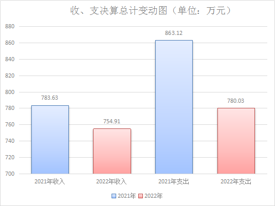 2022年度收入总计754.91万元、支出总计780.03万元。与2021年相比,收入总计减少28.72万元、支出总计减少83.09万元,分别下降3.66%、9.63%。收入主要变动原因是辖区人口减少,导致项目资金收入减少;支出主要变动原因是本年基本公共卫生服务项目资金未足额支付给村医,因此支出减少。